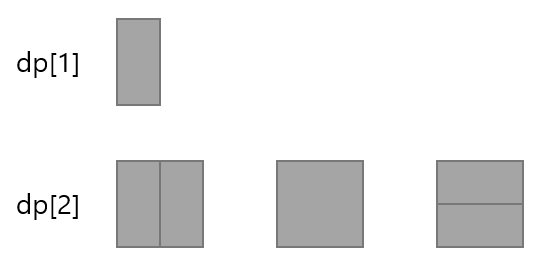 문제 링크 문제 분석 2×n 직사각형을 1×2, 2×1과 2×2 타일로 채우는 방법의 수를 구하는 문제이다. 문제 풀이 dp[n] = 2×n 직사각형을 3가지 타일로 채우는 방법의 수 라고 정의하자. 아래 그림을 보면,dp[1] = 1dp[2] = 3 이다. dp[n] 의 경우의 수를 구해주기 위해서dp[n-1] 의 경우의 수와 dp[n-2] 의 경우의 수를 보자. dp[n-1] 은 끝에 2×1 타일을 놓는 경우의 수를 구해주면 된다. dp[n-2] 는 끝에 1×2 타일 두개를 놓는 경우의 수와 2×2 타일을 놓는 경우의 수 두 가지를 모두 구해줘야 한다. 따라서, dp[n] = dp[n-1] + dp[n-2] * 2 와 같다.추가로 위의 값에 10,007 로 나눈 나머지를 저장하면 된다. ..